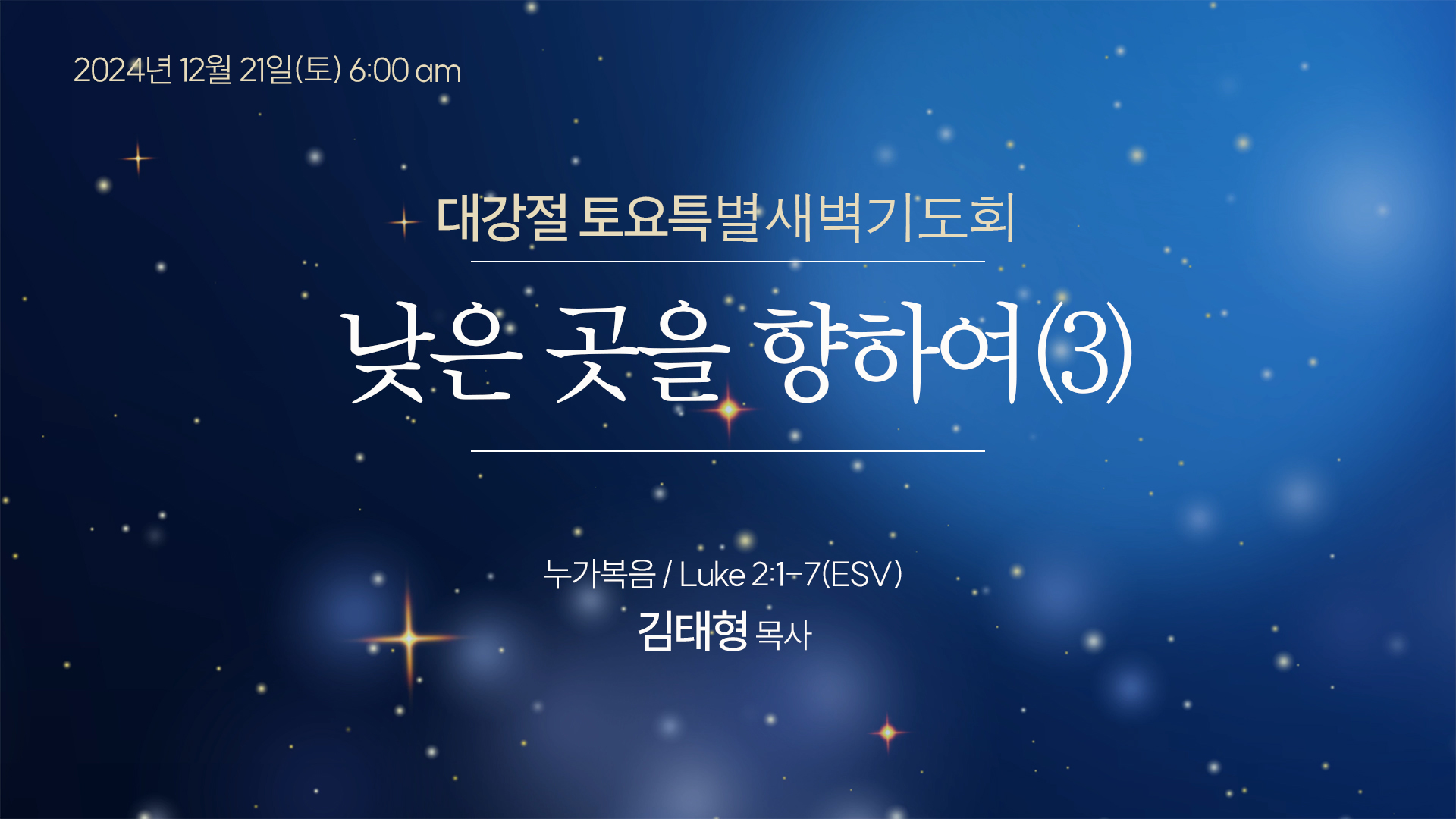 [] 2024 대강절 토요특새 페이지 정보 본문 대강절토요특새(12/21, 토) 6시. 낮은 곳을 향하여 3. (누가 1:7) 김태형 담임목사 *정성스럽게 아침국밥을 준비하였습니다. LIST 댓글 0 댓글목록 등록된 댓글이 없습니다.